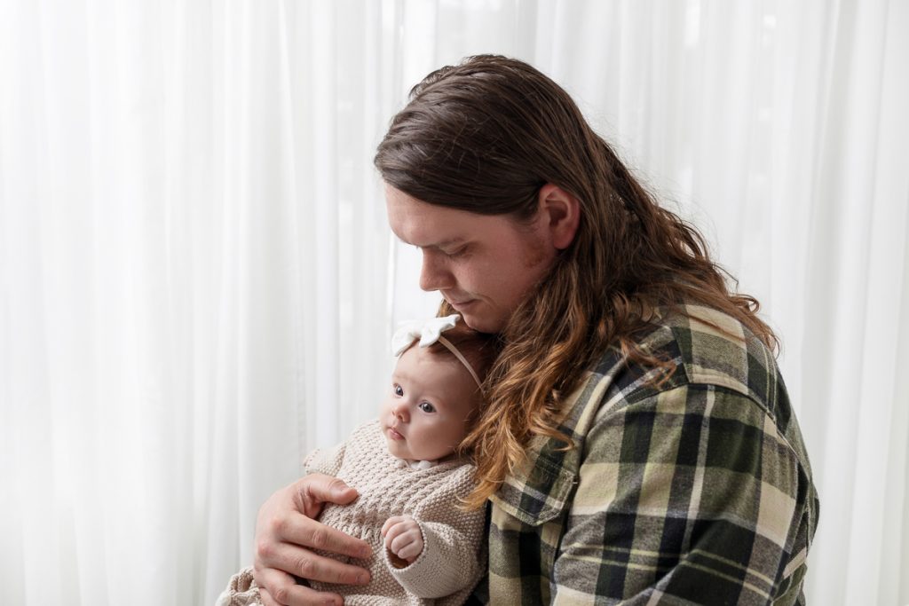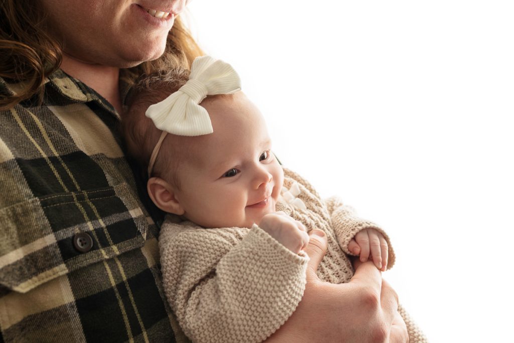 Sessions with slightly older babies offer a surprising amount of variety. Babies love being held, so we create a gallery filled with natural, connected family portraits. Parents get to snuggle in close, and the result is photos filled with connection. We also take time for individual photos of your baby, giving you a mix of family images and sweet solo portraits. This stage sits in a perfect window. Your baby still looks tiny, but they have enough head control and awareness to engage with the session.