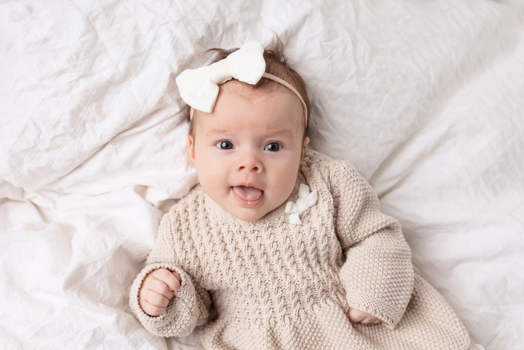 Babies at this stage interact with the world in a new way. They smile easily, follow voices, and lock eyes with the people they love most. In this recent session, we captured the sweetest expressions from this little one. Her bright eyes connected with her parents and the camera in a way that feels full of personality. These moments create images that feel honest and joyful.